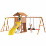Игровая площадка изготовлена из клееного соснового бруса и массива сосны .Дерево обработано безопасной декоративно-защитной пропиткой. Технология значительно увеличивает срок службы конструкций, повышает прочность древесины, защищает её от гниения и грибков.
