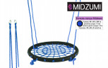 Качели-гнездо Midzumi выполнены из металлической рамы диаметром 80 сантиметров, с дополнительной защитной оплеткой ее бортиков, обтянутых прочным синтетическим канатом толщиной 10 мм выдерживающим нагрузку 100 кг. Плетеное синтетическое сидение качелей удобное и практичное, не собирает грязь и воду, при сильных загрязнениях его можно протереть.